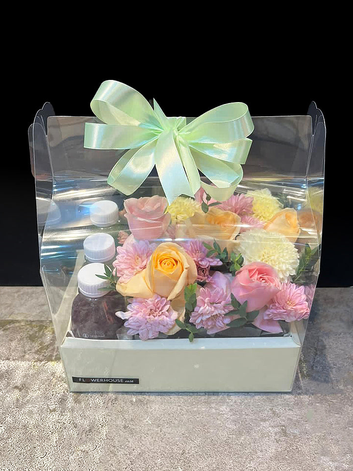 Our new hamper of 3 bottles of Juice drink from ReJuve with fresh flowers. It's a healthy choice and very suitable to cheer up our loved ones.