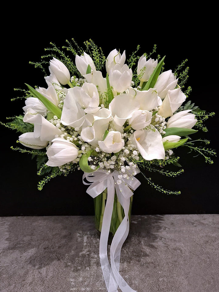A serene white arrangement of calla lily and tulips in clear vase